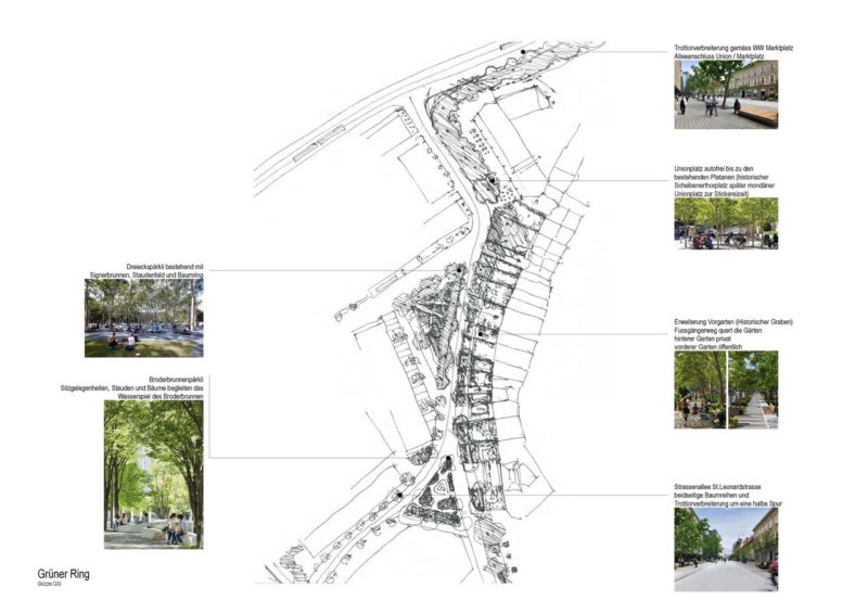 Die Reparatur des Grünen Rings (ehemaliger Stadtgraben) am Oberen Graben würde einen wichtigen Beitrag zum Stadtklima und der Aufenthaltsqualität leisten. Der Heimatschutz St.Gallen/Appenzell I.Rh. beauftragte GSI Architekten AG mit einer Studie zur Begrünung der nicht mehr genutzten Busspur.