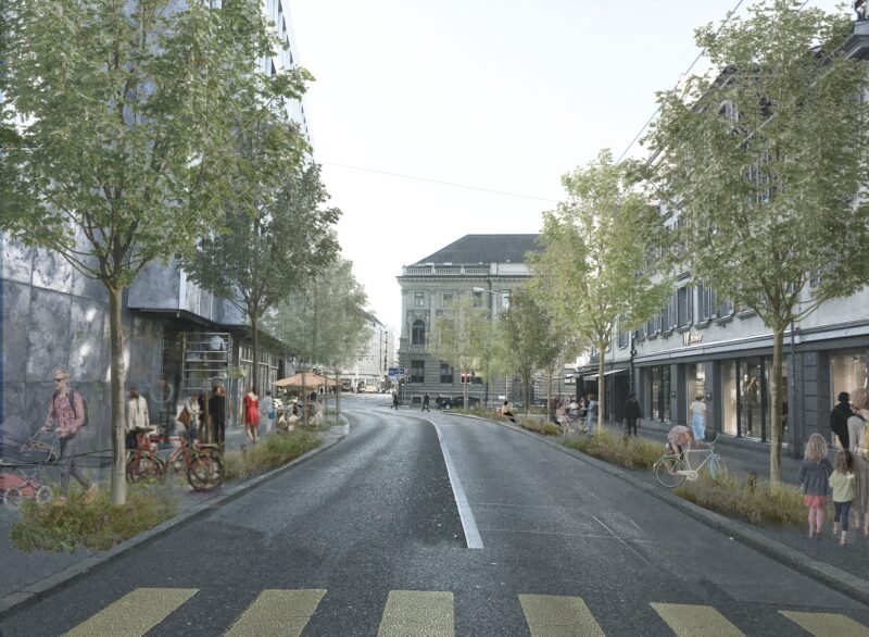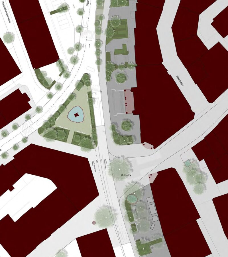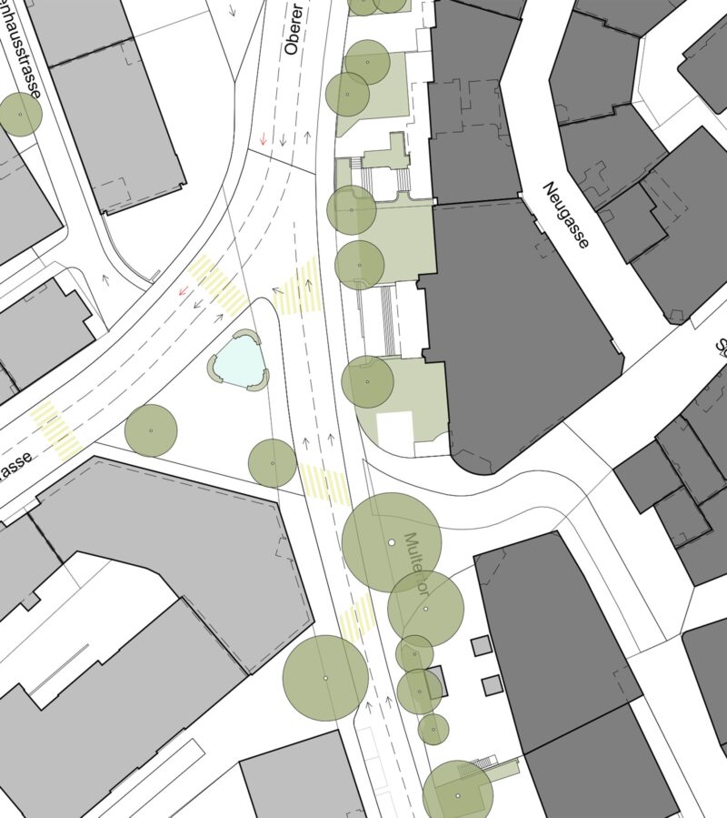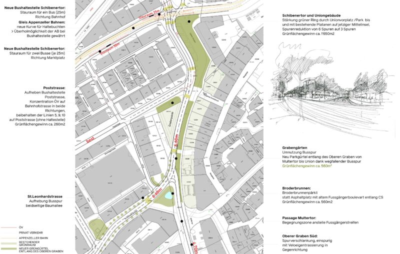 Am St. Galler Schibenertor und am Oberen Graben entsteht durch den Wegfall einer nicht mehr genutzten Busspur neuer Freiraum. GSI Architekten AG und der Heimatschutz St. Gallen / Appenzell I.Rh. schlagen vor, diesen Raum für die Pflanzung von rund 90 neuen Stadtbäumen zu nutzen. Die Reparatur des Grünen Rings – des ehemaligen Stadtgrabens – am Oberen Graben leistet damit einen wichtigen Beitrag zur Verbesserung des Stadtklimas und der Aufenthaltsqualität.