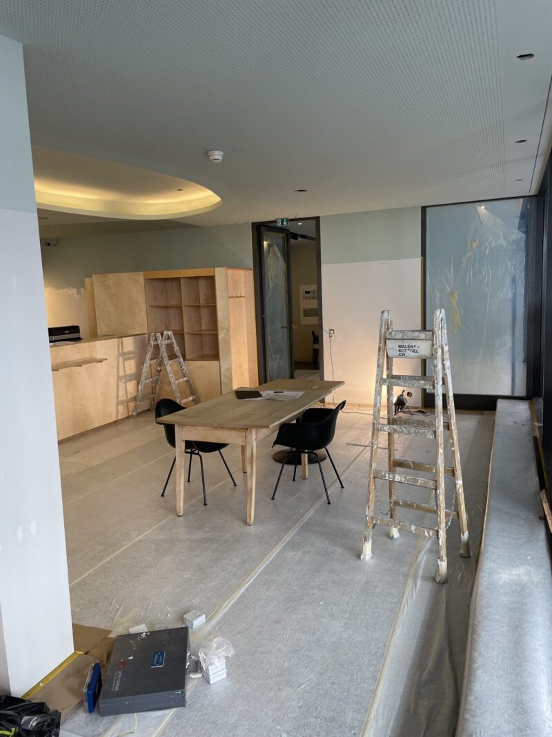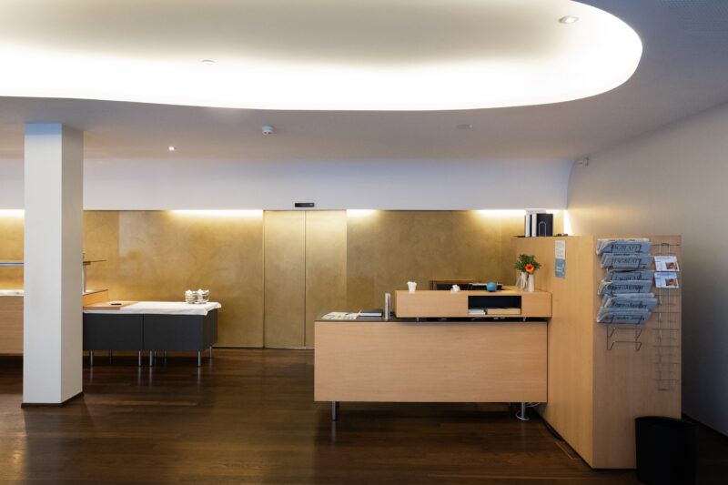 Dafür wurde eine neue Theke erstellt, die gleichzeitig neuer Ankunftsort für die Besucher ist. Dafür konnten nicht mehr verwendete Möbel der ehemaligen Wäscherei Schlösslipark (Zweigstelle Förderraum) sanft umgebaut und im Hotel Dom wiederverwendet werden.