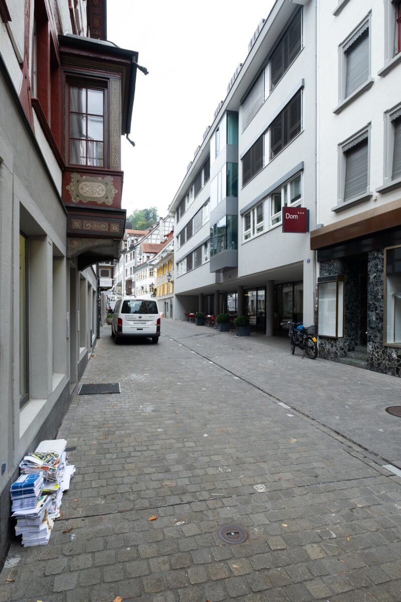 Das Hotel Dom wurde anfangs der 1960 Jahren erbaut. Im Erdgeschoss des damals aussergewöhnlich modernen Altstadthotels fanden verschiedene Verkaufsläden ihren Platz. In den oberen Geschossen wurden die Hotelräumlichkeiten untergebracht. Als die gemeinnützige Stiftung Förderraum das Haus 1998 übernimmt, zieht auch eine neue Struktur ein. 2005 wird das Hotel im Erdgeschoss mit einem Restaurantbetrieb und einer Reception erweitert.
