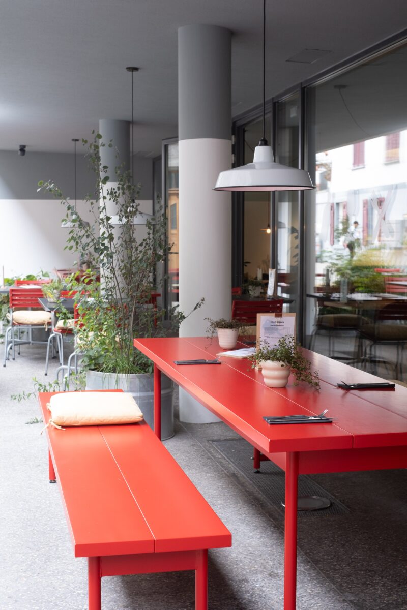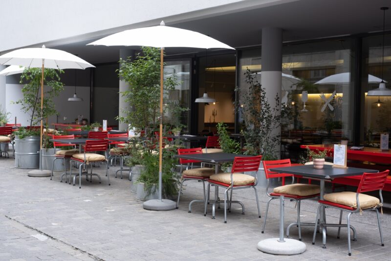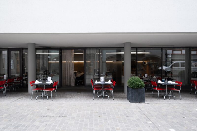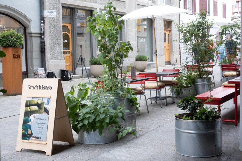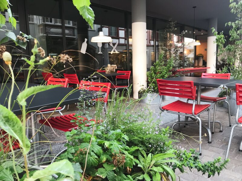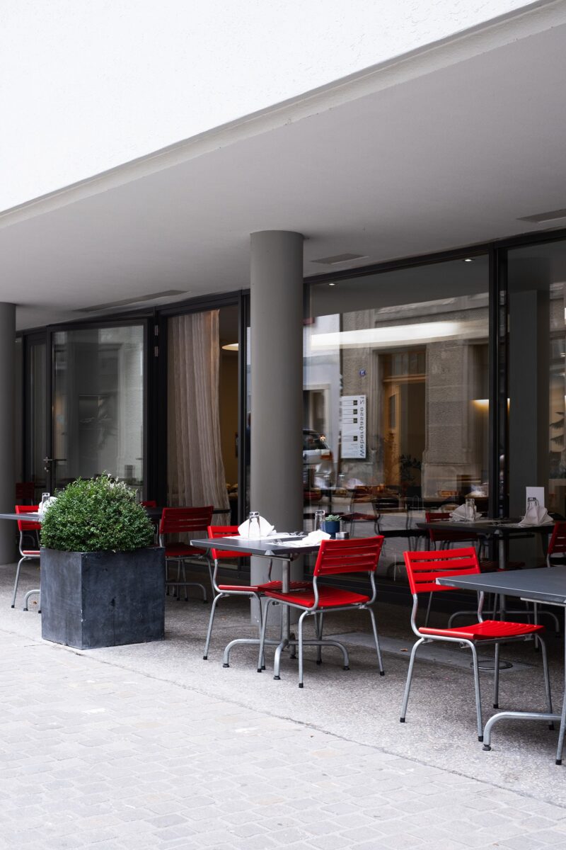 Im Innenhof wurde bereits realisiert, was auch in den Restauranträumlichkeiten entstehen soll: die aus einheimischen Wildsträuchern- und Stauden bestehende Begrünung unterstreicht das neue Konzept der Nachhaltigkeit. Sowie im Innenhof, wurde auch das Aussenrestaurant, welches direkt vor dem Gastraum liegt und als Scharnier zwischen dem Hotelbetrieb und dem öffentlichen Gassenraum fungiert, aufgewertet. In Gruppen arrangierte Pflanzgefässe aus verzinktem Stahl, wurden mit einheimischen Wild- und Schattenstauden sowie standortgerechten Sträuchern bepflanzt. Sie verleihen dem Aufenthaltsbereich unter den Arkaden ein gemütliches und einladendes Ambiente und dient als erweitertes ‘Kaffee-Zimmer’ im Freien.