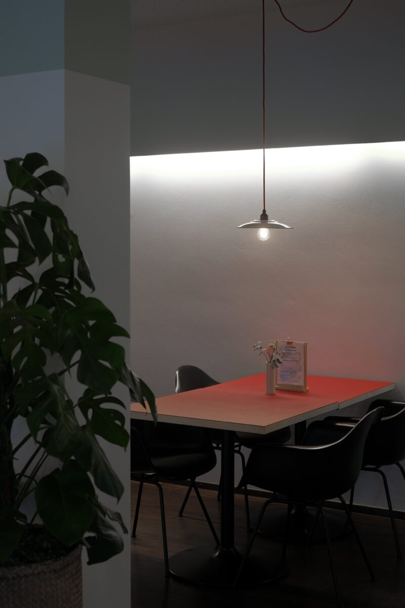 Die ehemalig indirekte Beleuchtung an der Decke und Rückwand im Gastroraum, wirkten kühl und trugen nicht zu einem einladenden Ambiente bei. Mit den neuen Pendelleuchten wird das Restaurant einerseits räumlich gegliedert und erzeugen mit dem sanften Licht gelichzeitig eine atmosphärische Stimmung.