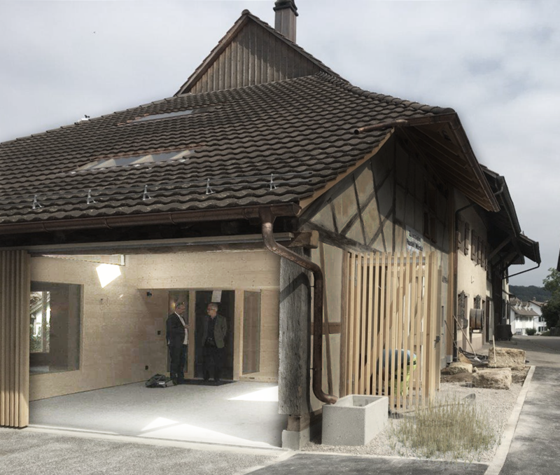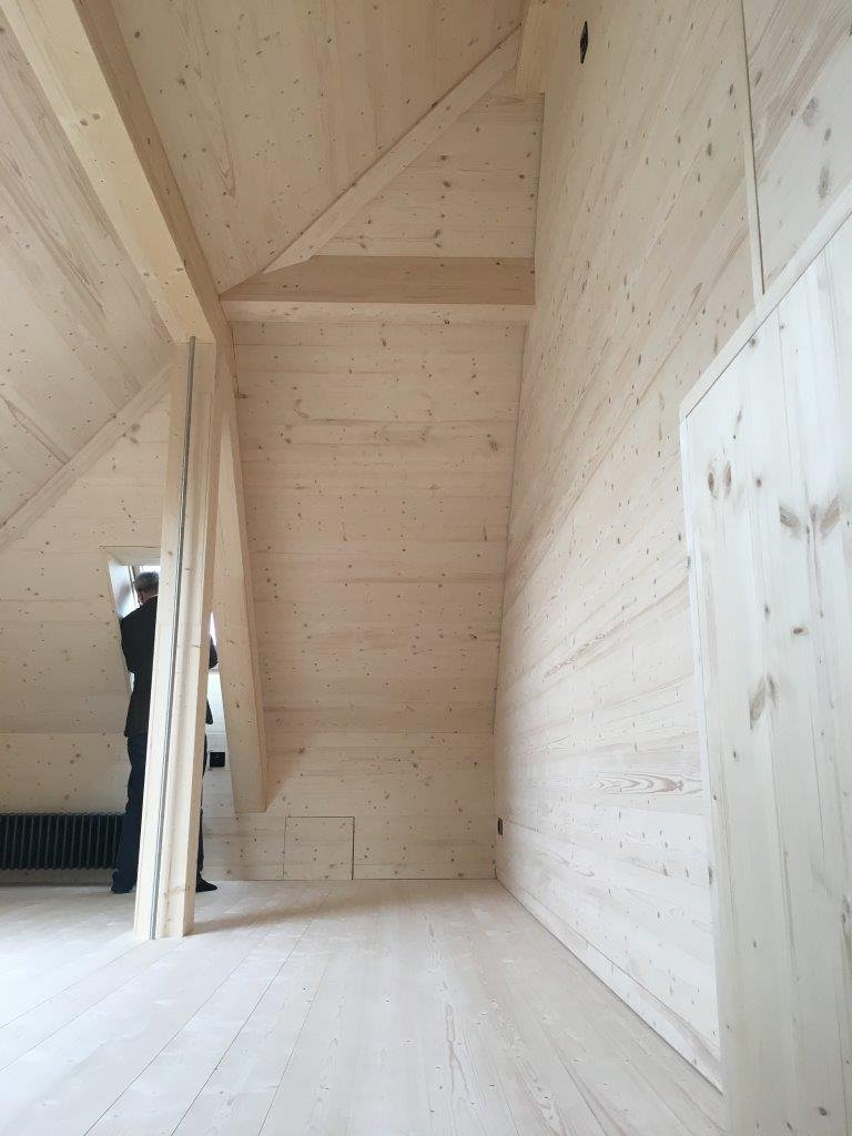 Die Transformation zur Wohnloft findet im Innern statt. Die Schichttrennung zwischen Neu und Alt wird durch den selbsttragenden und wärmegedämmten Holzeinbau klar ablesbar. Holzkuben stapeln sich im Grossraum übereinander und bilden ein verschachteltes inneres Raumgefüge. Auf drei Etagen organisiert das Erdgeschoss mit Tenne, Diele, Nasszelle, Kochen Essen Wohnen, das Obergeschoss mit Schlafbereich und Bad und darüber die Dachzone. Eine einfache Holzklappe im Boden des Erdgeschoss erschliesst den Keller. Die reduzierte Materialwahl Weisstannenoberflächen an Boden Wand und Decke schaffen ein ruhiges Pendent zur historischen Riegelwand. Die neuen, hellen Tannenriemen fügen sich zwischen die 250 jährige Fichtentragkonstruktion und sorgen für neues Leben.