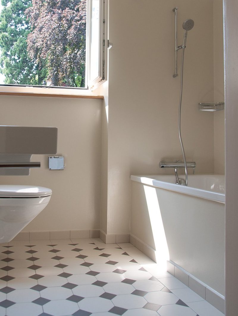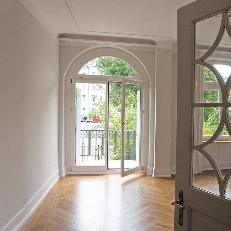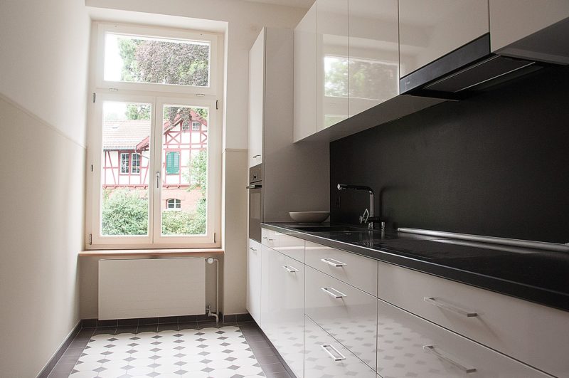 Deckenrosetten und profilierte Fensterbänke aus massivem Eichenholz sowie leichte Farbnuancen in den Herrschaftszimmern werten die Räume diskret auf. Die Küche birgt durch ihre Lage zum Garten und Blick zum charmanten Riegelhinterhaus ein besonderes Potential. Für eine stimmungsvolle Wirkung als Wohnküche wurden neu historische Manufakturfliesen und ein sandfarbenes Brustflies eingebaut. Eine hochglänzend weisse Einfrontküche bringt eine zeitgemässe Erscheinung und Komfort. Das Bad wurde mit einem fugenlosen Belag und den analogen Prinzipien gestaltet.