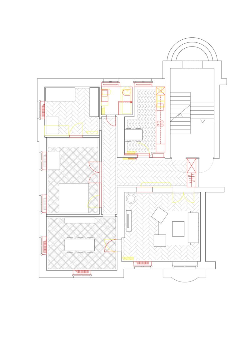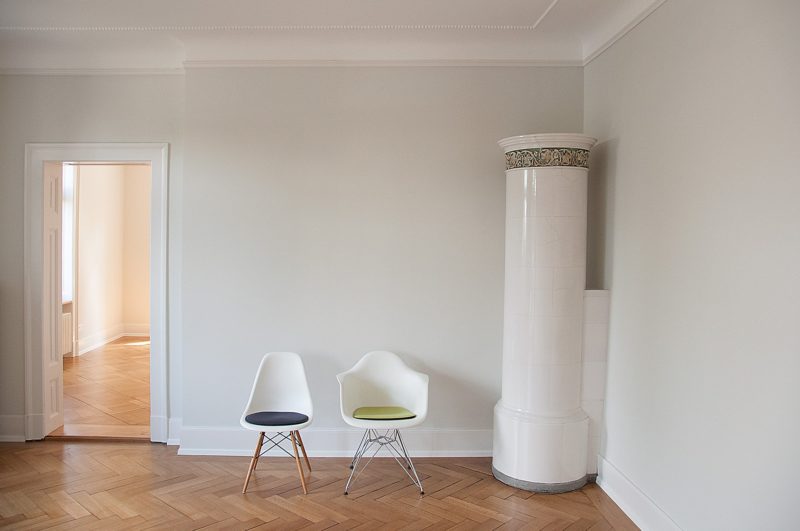 Im schmuckvollen Haus an der Scheffelstrasse mit Garten und Hinterhaus wurde die Parterrewohnung umgebaut. Die Ausstattung blieb seit Kriegsende unberührt. Grosse Räume mit 3 Meter Raumhöhe, Parkett und Stukkaturen bilden eine zeitlose Basis für schönes Wohnen und sollten wieder bestmöglich hergerichtet und von sperrigen Wandschränken befreit werden. Der schmucke Kachelofen konnte restauriert werden und darf fortan wieder eingefeuert werden.