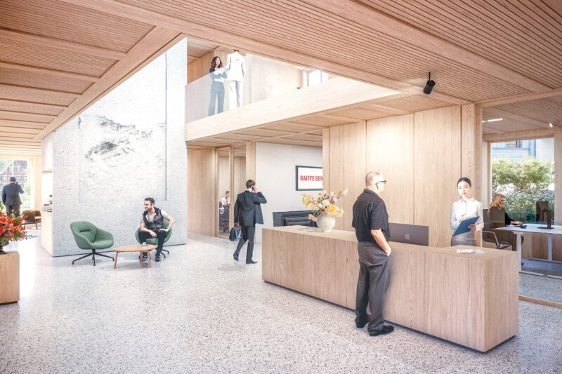 Schon beim Betreten der 24-H Zone kann der Kunde auf Wunsch mit Beratern in Kontakt treten. Ein zweiter Bancomat und der direkte Zugang zum Automatenraum von der Vorzone her, bieten Kunden sowie Mitarbeitern höchsten Komfort. Vielfältige Möglichkeiten für formelle und informelle Gespräche runden das Raumprogramm im Erdgeschoss ab und verdeutlichen die Willkommenskultur der Raiffeisenbank. Die Raiffeisenbank präsentiert sich mit offenen, halboffenen und geschlossenen Beratungsmöglichkeiten in unterschiedlichen Grössen und vielfältiger Möblierung. Dank der Anordnung aller Beraterräume im Erdgeschoss lässt sich die Zonentrennung einfach realisieren.