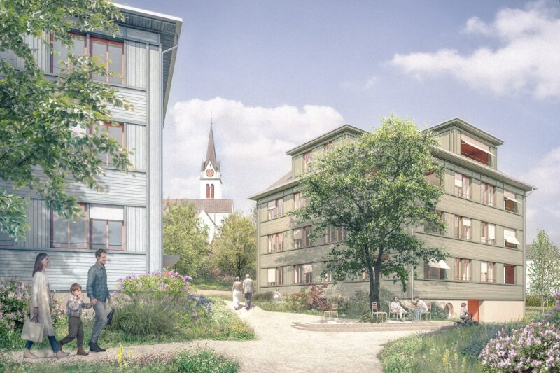 Die grossen Räume zwischen dem strassenseitigen Gebäuden wahren Blickbezüge zum Ortskern mit der katholischen Kirche, sodass dieser wichtige Orientierungspunkt nach wie vor erhalten bleibt. Das westliche Wohnhaus orientiert sich am regemässig bebauten Wohn-und Geschäftsquartier Kirchgasse-Landhausstrasse. Es rückt aber bewusst etwas ab, um grosszügige Gartenflächen gegen Westen zu schaffen, sowie eine Zäsur an der Schnittstelle der Baugebiete zu setzen. Das zentrale Wohnhaus bildet den Rücken für den zentralen Freiraum der Häusergruppe, der zugleich als Eingangsplatz dem dörflichen und geschäftlichen Leben dienen soll.