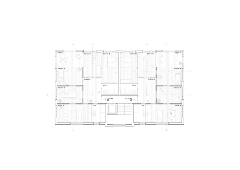 Alle 20 Wohnungen geniessen dank dreiseitiger Ausrichtung vielfältige Blickbezüge und optimale Tageslichtausnutzung. Ähnlich den ortstypischen Stickerhäusern werden den gut proportionierten Zimmern möglichst keine fixen Nutzungen zugeteilt. Die Wohnungen erfüllen so flexibel die Wünsche einer breiten Zielgruppe (Singles, Paare, Familien, Senioren etc.). Dies fördert die Mannigfaltigkeit der Bewohner und stärkt den Zusammenhalt sowie die Resilienz der Siedlung. Der Wohnungsmix besteht aus annähernd gleich vielen 3.5 & 4.5 Zimmer-Wohnungen und wird durch eine 2.5 Zimmer-Wohnung ergänzt. Im quadratischen Wohngebäude sind die Wohnungen etwas kompakter organisiert, um die Vielfalt in der Siedlung weiter zu stärken und die Interessentengruppe zu erweitern. Jede Wohnung verfügt über mindestens eine Nasszelle mit Tageslicht.