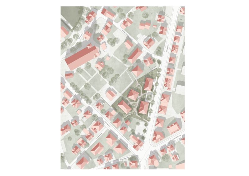 Das Projekt nimmt das ortbildprägende Element der regelmässig gereihten Häuser entlang der Landstrasse auf. Gleichwohl möchte das Projekt mit vier mittelgrossen Baukörpern grosse und kleine Freiräume Durchgrünung und dörfliche Durchlässigkeit wahren. Zwei strassenbegleitende Bauten bilden durch die Parallellage den Ankerpunkt der Bebauung. Sie rücken aber von der Landstrasse ab und bilden eine Vorzone, die Ankunftsbereiche schafft und durch Baumbestand der Strassenraumaufwertung dienen sollte.