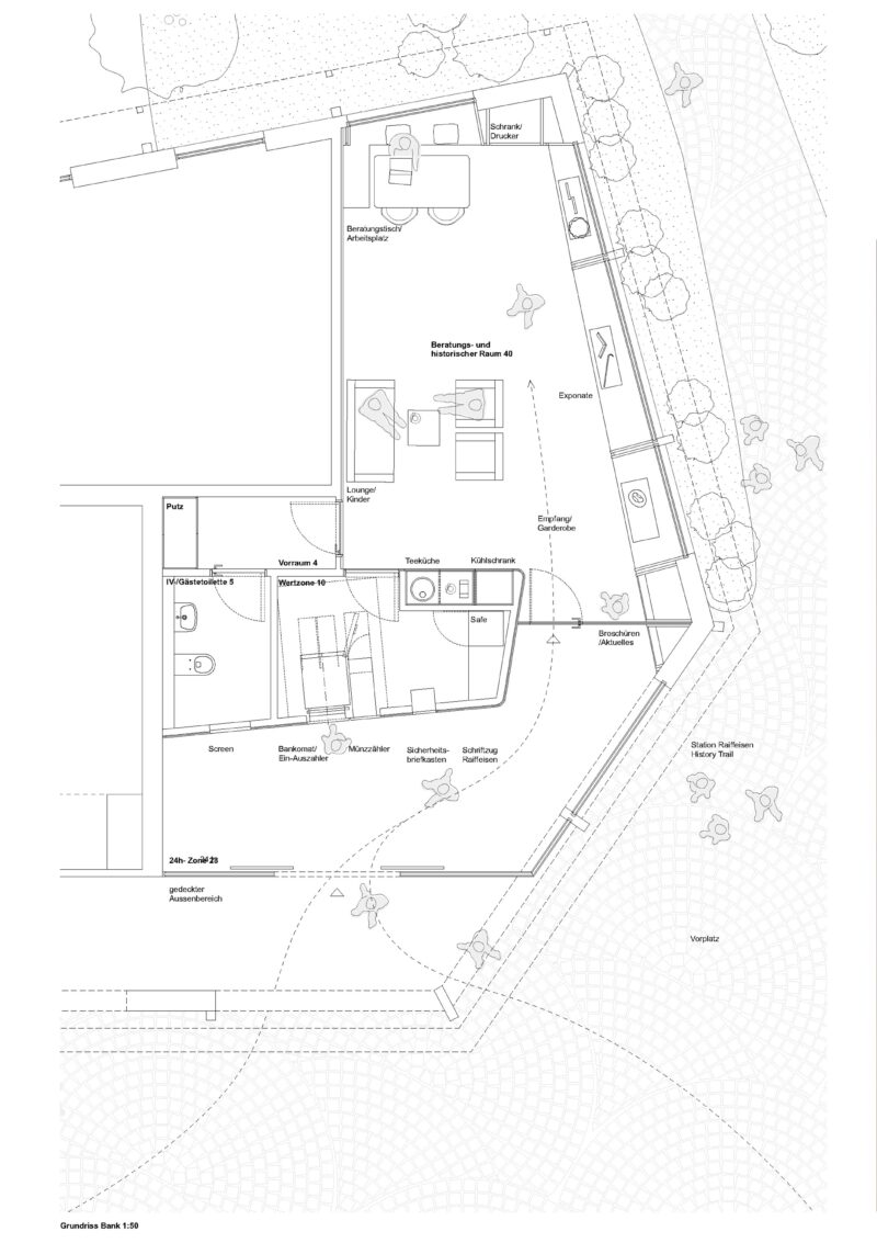 Die erste Raiffeisenbank in der Schweiz erhält würdige und individuell gestaltete Räumlichkeiten. Über einen gedeckten Vorbereich gelangt man in die 24-h Zone. Diese ist durch die grossformatige Verglasung bereits vom Vorplatz aus gut sichtbar.