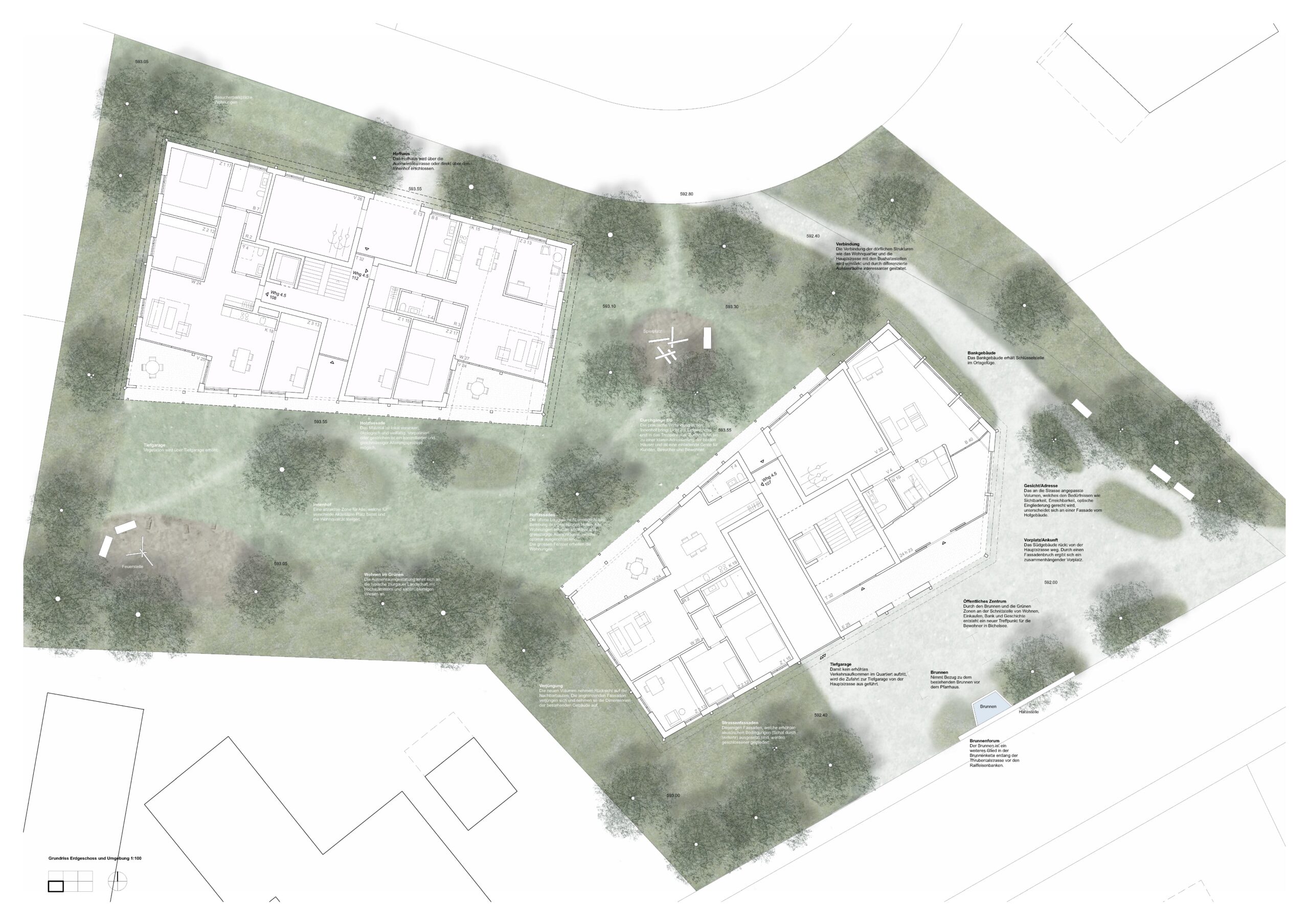 Damit sich die neue Raiffeisenbank Bichelsee in die dörfliche Körnung integrieren kann, werden zwei Volumen gesetzt. Diese besitzen grundsätzlich den gleichen Grundriss, können aber auf die unterschiedlichen Lagen und Anforderungen individuell reagieren. Das dreigeschossige Südgebäude rückt durch einen Fassadenknick von der Hauptstrasse weg und schafft Raum für einen Vorplatz. Die einladende Geste dient insbesondere dem öffentlich genutzten Erdgeschoss im südöstlichen Bereich. Durch den Brunnen und die grünen Zonen an der Schnittstelle von Wohnen, Einkaufen, Bank und Geschichte entsteht ein neuer Treffpunkt für die Menschen in Bichelsee.