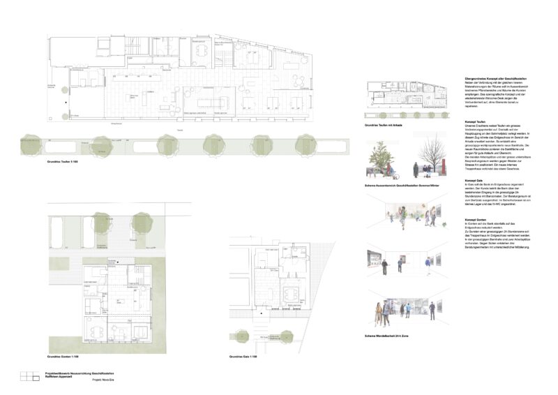 Durch den Wandel des Bankgeschäftes, indem die Beratung der Kunden beim Tagesgeschäft im Vordergrund steht, wird die Geschäftsstelle Raiffeisen Teufen umgeplant. Der Haupteingang zum Bankgebäude wird neu am Bahnhofplatz zu liegen kommen. So wird eine grosszügige, wohlproportionierte Kundenhalle geschaffen. Die neuen Raumblöcke zonieren die Bankfläche und sorgen für gute Abläufe und Übersicht.