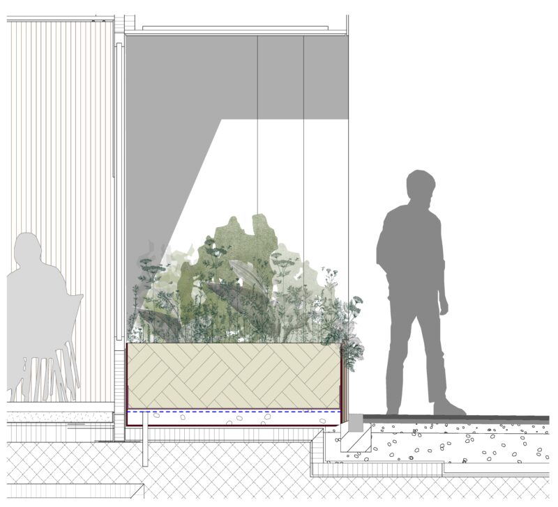 Ein Blickfang werden die neu erstellten bepflanzten Fassadennischen, welche das scharfkantige Gebäude auflockern. Vom Bahnhofplatz durch die begrünte Nische wird der Blick durch das Gebäude in die neu bepflanzte «biodiverse Oase» geleitet, welche neu für die Mitarbeitenden zugänglich wird.